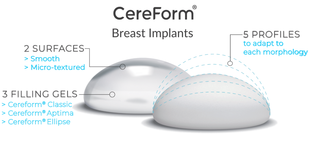 Implanturile Cereform® sunt realizate din gel de silicon coeziv, oferind un aspect natural, stabilitate în timp și un nivel ridicat de siguranță. Gama permite adaptarea intervenției în funcție de nevoile fiecărei paciente, fiind utilizată atât pentru augmentare estetică, cât și pentru reconstrucție mamară.